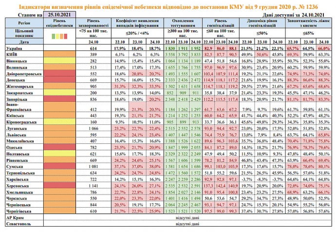 Станом на 25 жовтня до "червоної" зони епідемічної небезпеки потрапили шість областей, ще шість регіонів наблизилася до "червоної" зони за показниками.