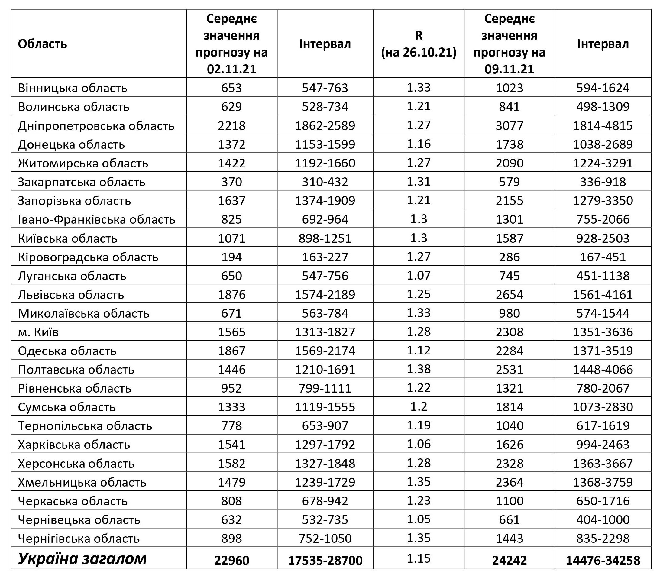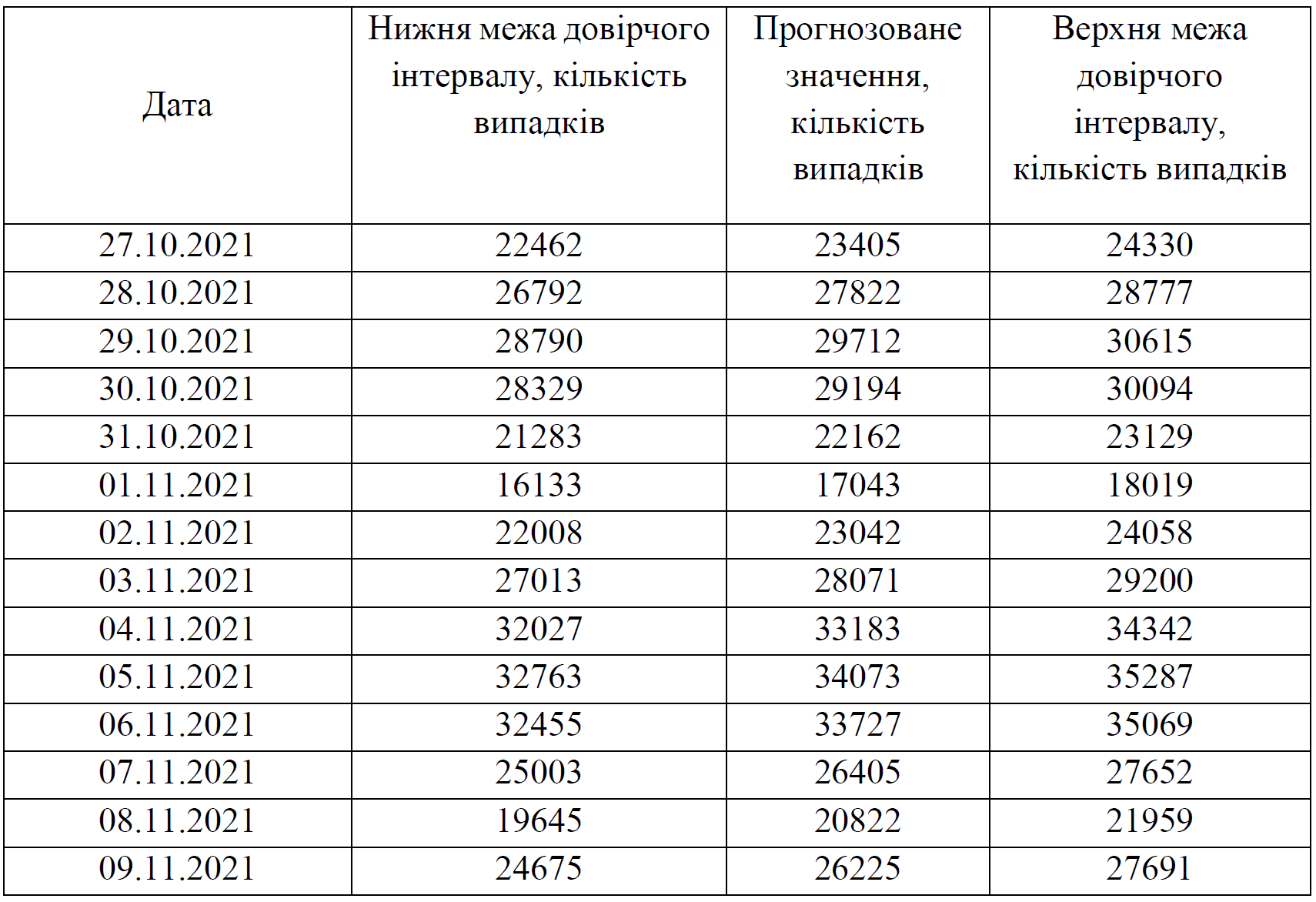 Згідно з прогнозними обчисленнями (в яких закладено поточну тенденцію до збільшення кількості нових виявлень), середня кількість нових випадків дорівнюватиме 22960 (SEIR_U), 24625 (Prophet) протягом тижня 27 жовтня - 2 листопада 2021 року та 24242 (SEIR_U), 28929 (Prophet) – протягом тижня 3–9 листопада 2021 року".