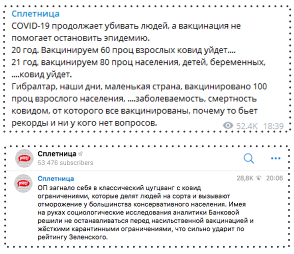 Telegram-канал "Сплетница" також було помічено у поширенні в Україні дезінформації, яка направлена на дискредитацію вакцин.