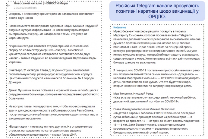 З іншого боку, якщо подивитися на Telegram-канали, які адмініструються Росією для жителів ОРДЛО та окупованого Криму, йдеться про діаметрально протилежні наративи. В публікаціях населення інформують про необхідність щеплень, висміюються антивакцинатори, залучаються лідери думок та блогери для просування вакцин.