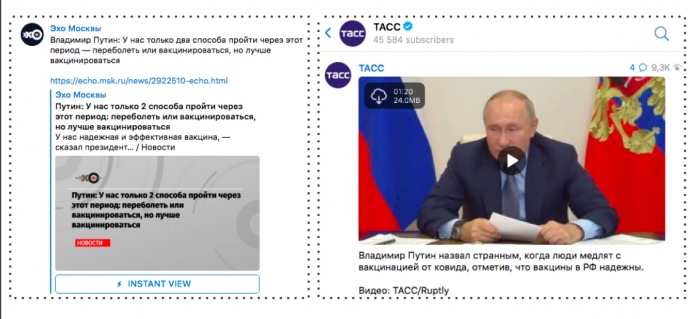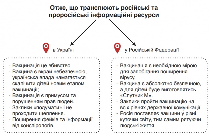 Telegram-канали просувають деструктивні наративи в Україні щодо вакцинації, при цьому адмініструються РФ, яка має полярно інший порядок денний – заохочувати громадян Росії до вакцинації та запевняти їх у необхідності щеплення.