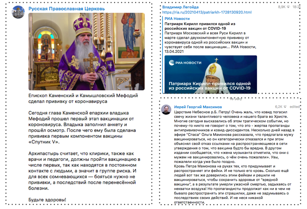 Проте ця ж церква, яка направлена на російську аудиторію, навпаки, закликає вакцинуватися, поширює інформацію про види вакцин, розвінчує міфи, пов’язані з ними, та зазначає, що щеплення не є гріхом.