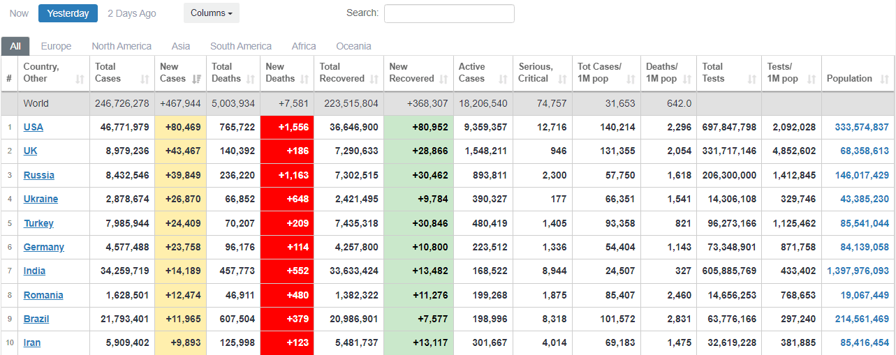 28 жовтня у світі виявили 467 944 нові COVID-випадки.