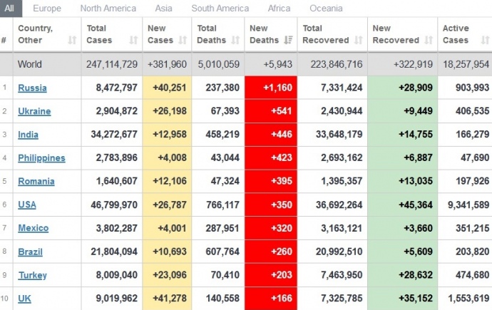 У світі за добовою смертністю від коронавірусу лідирують Росія та Україна.
