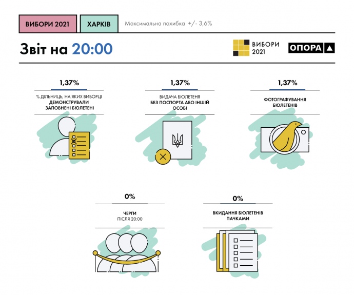 ОПОРА відзначає відсутність черг виборців у приміщеннях для голосування на момент закриття дільниць у двох округах та місті Харкові.