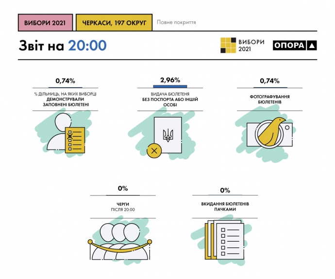 Разом з тим, спостерігачі ОПОРИ констатують відсутність масових порушень виборчих процедур з боку членів ДВК та інших суб’єктів виборчого процесу на позачергових виборах харківського міського голови та проміжних виборах народних депутатів в ОВО №184 (Херсонська обл.) та ОВО №197 (Черкаська обл.) у період між 16:00 та 20:00.