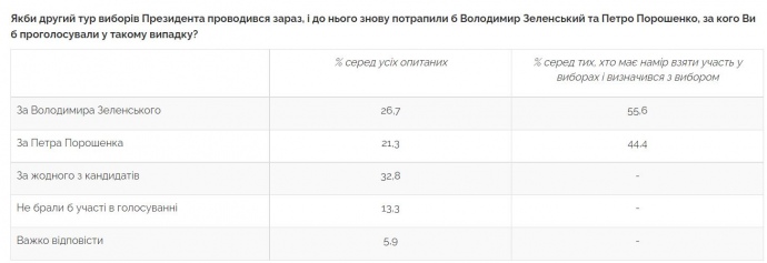 Дослівно: "Якби відбувався другий тур виборів президента і до нього потрапили В.Зеленський та П.Порошенко, то 26,7% серед усіх опитаних відповіли, що проголосували б за Зеленського, а 21,3% — за Порошенка".