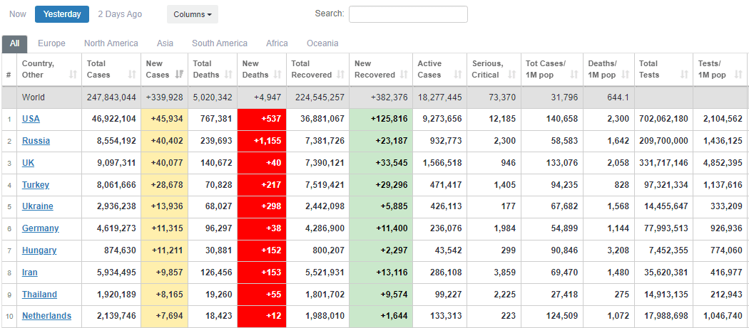 31 жовтня в світі виявили 339 928 нових випадків COVID-19.