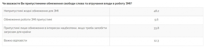 48,2% опитаних відповіли, що вважають неприпустимими будь-які обмеження свободи слова та втручання в роботу медіа, а 5,6% - припустимими.