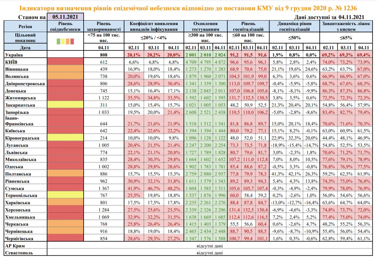 Станом на 4 листопада у "червоній зоні" перебували Київ і 15 областей.