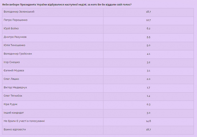 Водночас за серед кандидатів на посаду президента, за яких не проголосують за жодних обставин, респонденти називали Зеленського (31,9%), Порошенка (31,6%), Медведчука (24,7%).