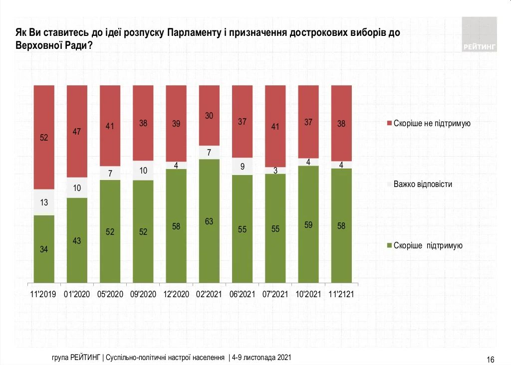Деталі: Ідею розпуску Верховної Ради та призначення нових парламентських виборів підтримують 58%, не підтримують – 38%.