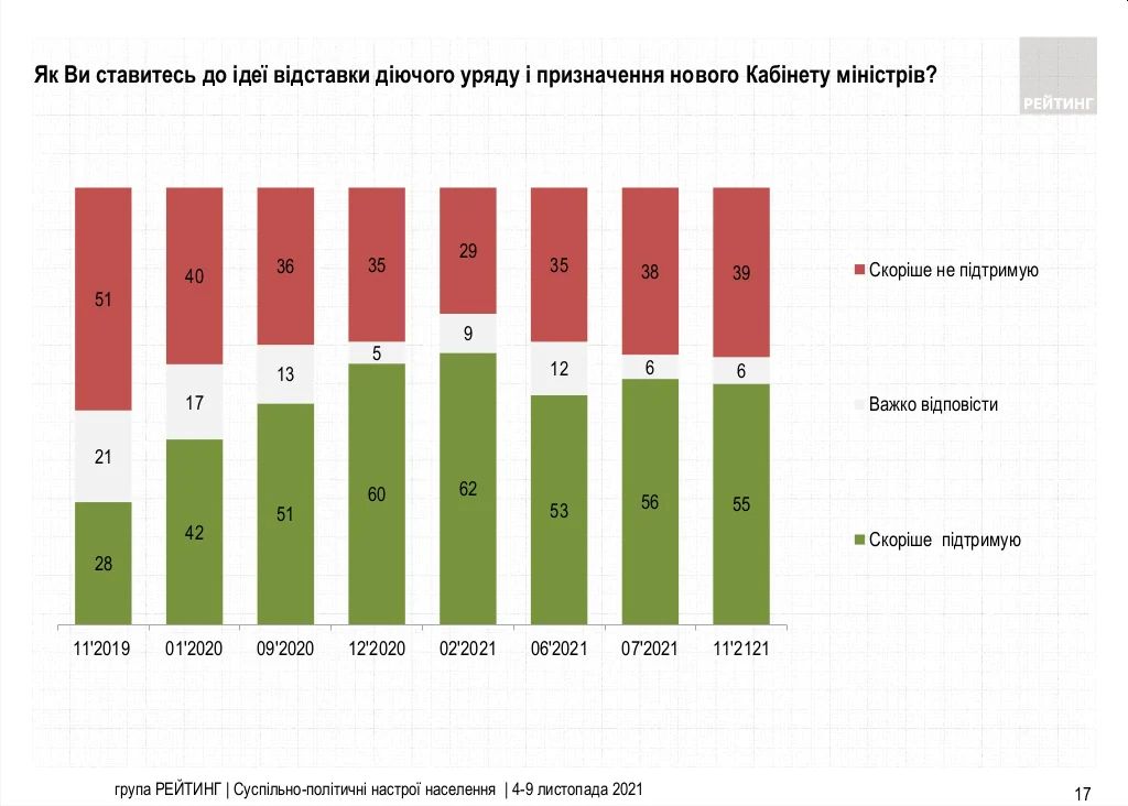 Відставку уряду і призначення нового Кабінету міністрів підтримують 55% опитаних, не підтримують – 39%.