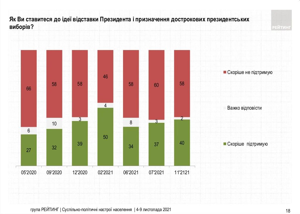Ідею відставки президента та призначення дострокових виборів голови держави підтримують 40% опитаних, не підтримують 58%.