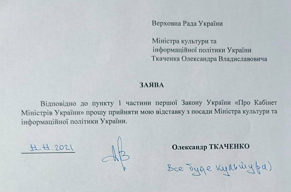 Олександр Ткаченко написав заяву про відставку з посади міністра культури та інформаційної політики, зокрема, через раптове для нього рішення уряду забрати Держкіно в його міністерства та через малий бюджет, який планується виділити на культуру у 2022 році.