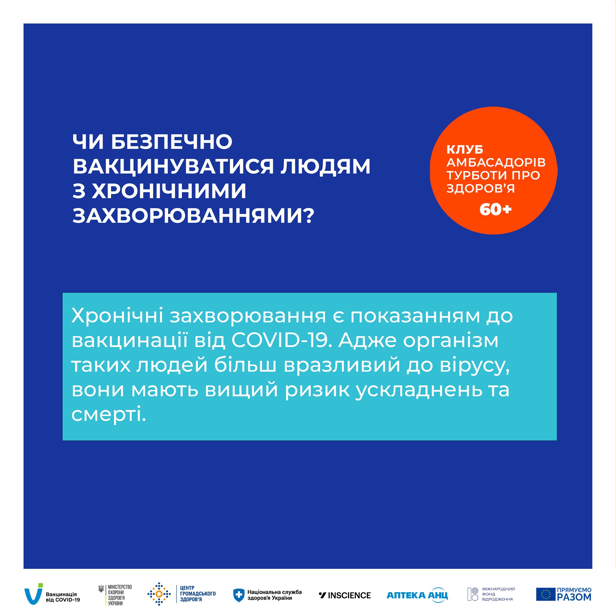Також наголошується, що хронічні захворювання є не протипоказанням, а навпаки показанням для вакцинації, адже організм таких людей більш вразливий до вірусу і вони мають вищий ризик ускладнень та смерті.
