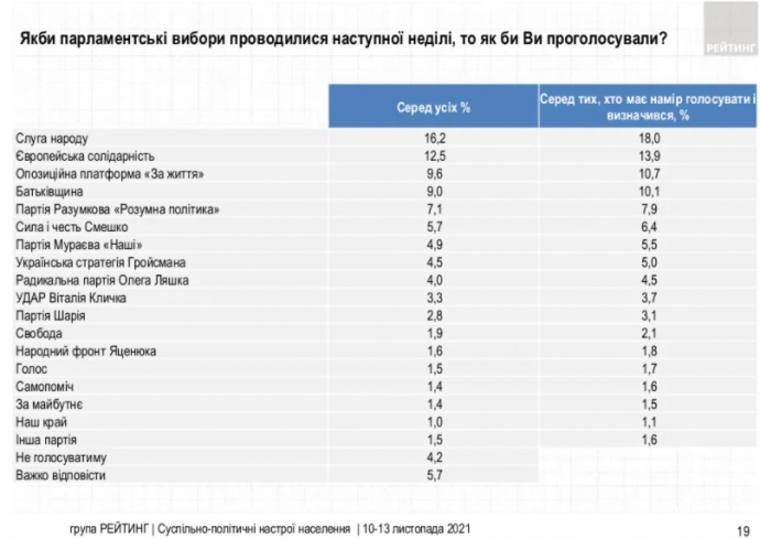 Рейтинг інших політичних сил дещо нижчий. Так, партію Разумкова "Розумна політика" підтримують 7,9%, "Сила і честь" – 6,4%, партію Мураєва "Наші" – 5,5%, партію "Українська стратегія Гройсмана" – 5,0%, Радикальну партію – 4,5%, "УДАР Віталія Кличка" – 3,7%, партію Шарія – 3,1%, ВО "Свобода" – 2,1%.