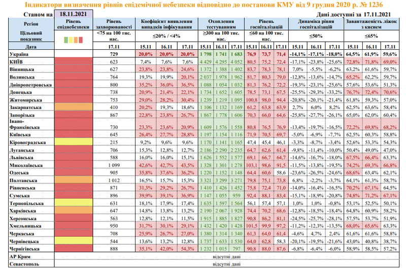 Станом на 18 листопада у "червоній" зоні епіднебезпеки перебувають Київ та 18 областей – Вінницька, Волинська, Дніпропетровська, Донецька, Житомирська, Запорізька, Івано-Франківська, Київська, Луганська, Львівська, Миколаївська, Одеська, Рівненська, Сумська, Херсонська, Хмельницька, Чернігівська та Черкаська.