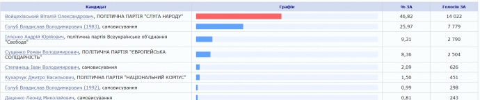 На другому місці самовисуванець Владислав Голуб – наразі має менше ніж 26% голосів.