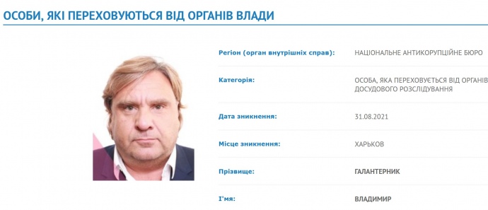 Деталі: Згідно з карткою розшуку, 51-річний Галантерник зник у Харкові 31 серпня 2021 року і тепер переховується від органів досудового розслідування.