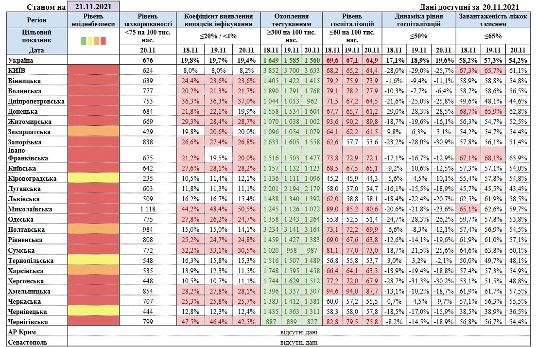 Станом на 20 листопада "червоними" по рівню коронавірусної епіднебезпеки є столиця та 18 областей України.