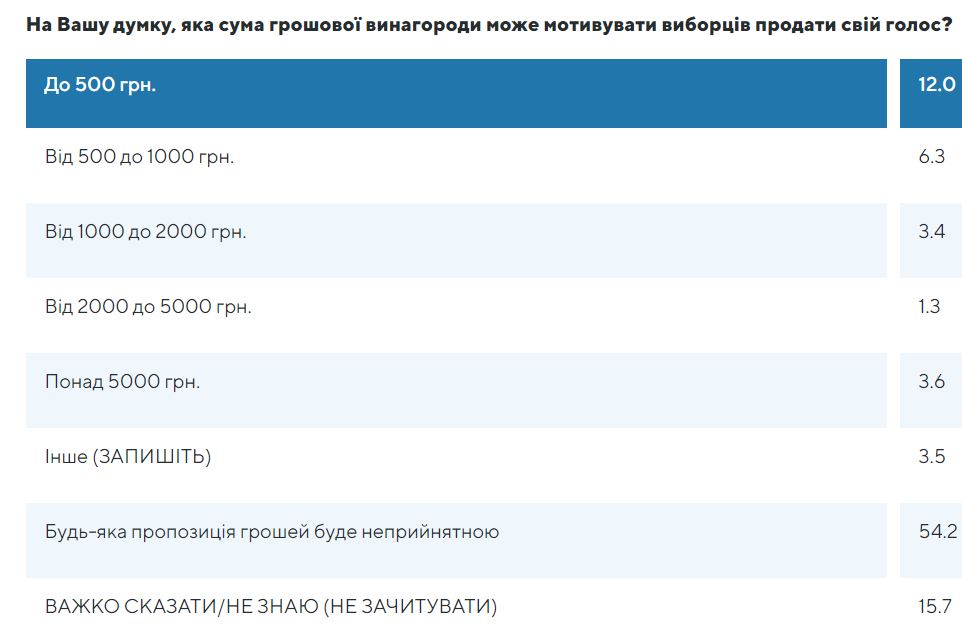 За результатами дослідження, більше 50% українців готові продати свій голос на виборах за первних обставин, при цьому для 12% респондентів вистачило б винагороди у менш ніж 500 грн.