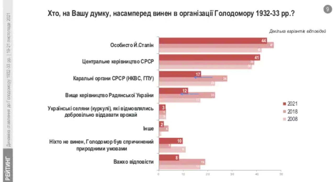 Дослівно: "Найчастіше опитані вважають винним в організації Голодомору особисто Й.Сталіна – 44% (у 2018 році таких було 47%, 2008 – 43%) та загалом центральне керівництво СРСР – 41% (у 2018 – 39%, 2008 – 38%). Ще 17% (у 2018 – 28%, 2008 – 23%) покладають вину за геноцид на каральнi органи СРСР (НКВС, ГПУ), 12% (у 2018 – 23%, 2008 – 17%) – на вище керівництво Радянської України.