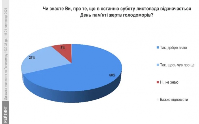 Загалом 68% громадян зазначили, що добре знають про те, що в останню суботу листопада відзначається День пам’яті жертв голодоморів в Україні. Ще 24% зазначили, що щось чули про це, 8% – взагалі не знають.