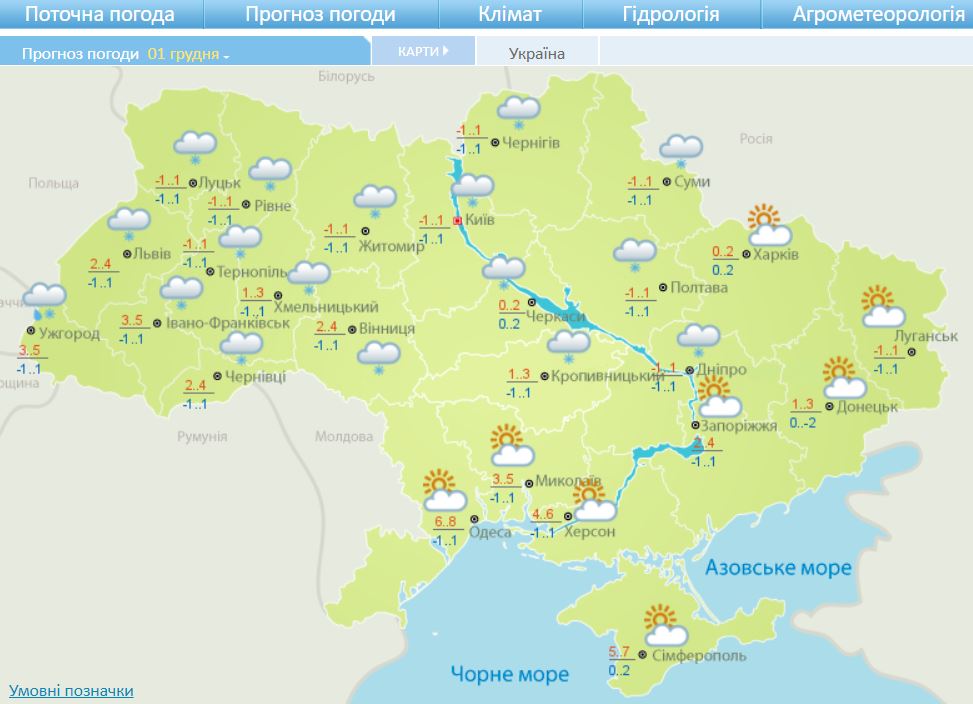 У середу 1 грудня в Україні прогнозують сніг, подекуди мокрий сніг, на дорогах попереджають про ожеледицю.