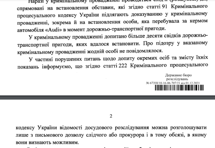 Деталі: Вказано, що наразі у кримінальному провадженні проводяться слідчі (розшукові) дії, спрямовані зокрема й на встановлення особи, яка перебувала за кермом автомобіля "Аудї" в момент дорожньо-транспортної пригоди.