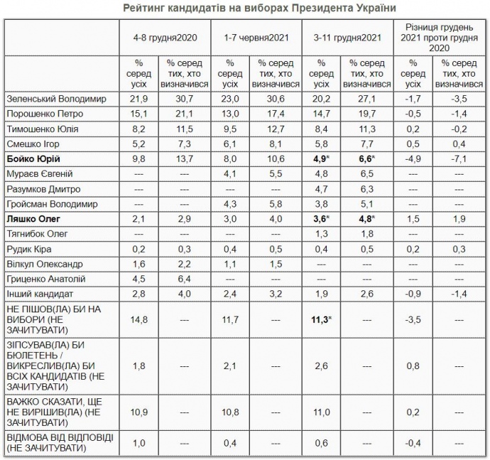 Водночас, за рік рейтинг Юрія Бойка серед тих, хто визначився, знизився вдвічі - з 13,7% у грудні 2020 року до 6,6% у грудні 2021 року.