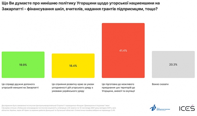 Зокрема, за результатами регіонального опитування, проведеного у серпні-вересні у 2020 році, 31,5% респондентів назвали дії Угорщини дружньою допомогою угорській меншині на Закарпатті, а ще 40% – сприянням розвитку краю за умови узгодженості дій угорського уряду з умовами українського уряду.