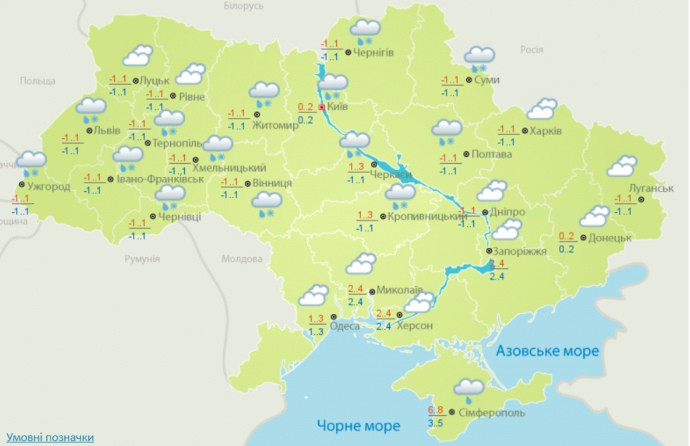 У найближчі дві доби на території України атмосферні фронти зумовлять опади, температура коливатиметься біля нуля градусів.