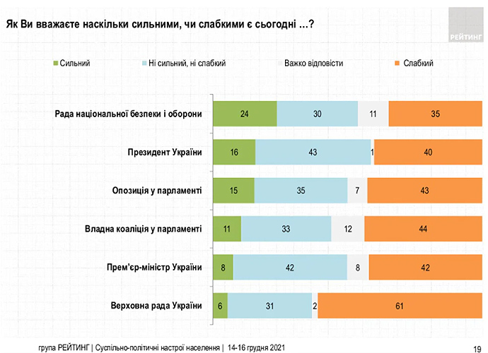 24% українців вважають Раду нацбезпеки та оборони сильним органом, тоді як Кабінет міністрів вважають сильним 8%, а Верховну Раду – лише 6% опитаних.