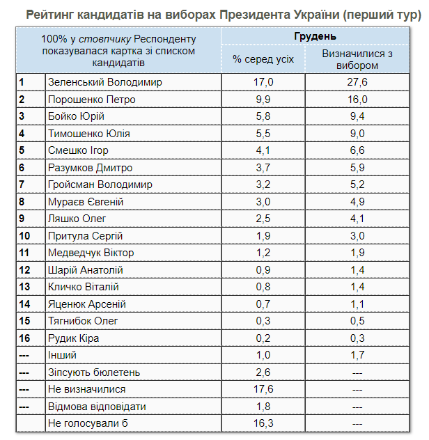 Деталі: На виборах президента України в першому турі, якби він відбувався в середині грудня, найбільшу підтримку отримав би Володимир Зеленський, за якого проголосували б 17% серед усіх респондентів і 27,6% серед тих, хто визначився з вибором.