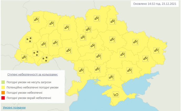 Державна служба з надзвичайних ситуацій попереджає 24 грудня про ожеледицю та сильний вітер майже в усіх регіонах України.