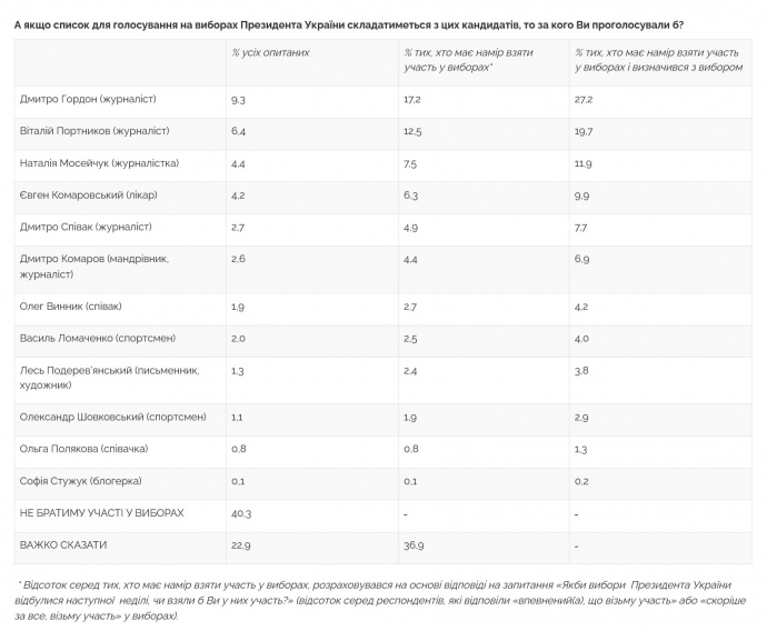 При цьому найбільше голосів отримав би журналіст Дмитро Гордон (9% серед усіх опитаних або 27% тих, хто візьме участь у виборах і визначився, за кого голосуватиме).