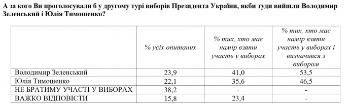 У разі виходу до другого туру Зеленського і Юлії Тимошенко за президента проголосували б 53,5% тих, хто візьме участь у виборах і визначився, за кого голосуватиме, за Тимошенко ˗ 46,5%.