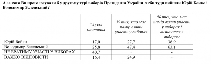 Якби до другого туру вийшли Зеленський та співголова ОПЗЖ Юрій Бойко, за Зеленського проголосували би 63%, за Бойка ˗ 37%.