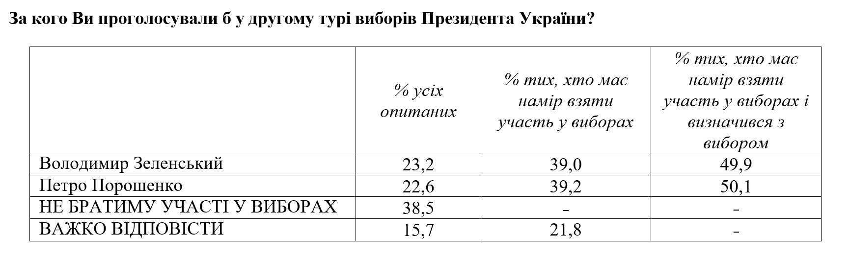 Якби суперником Зеленського в другому турі був його попередник Петро Порошенко, вони обидва набрали б по 50% голосів.