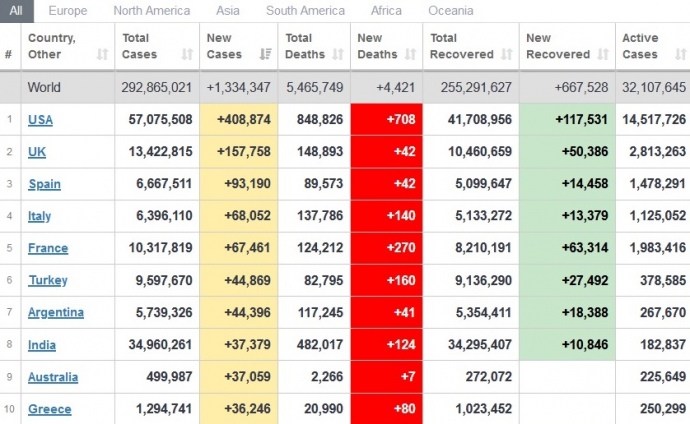 Зокрема, у США зафіксували майже 409 тисяч, у Британії – понад 157 тисяч і в Іспанії – понад 93 тисячі нових інфікувань.