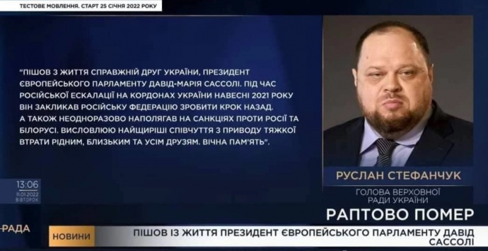 Деталі: Плутанина сталася 11 січня. Телеканал повідомляв про те, що голова Ради співчуває через смерть голови Європейського парламенту Давида Сассолі. У цей момент на екрані показали фото Стефанчука, а під ним напис великими літерами: "РАПТОВО ПОМЕР". Поруч була цитата спікера зі словам співчуття, але все одно можна було зробити висновок, що помер не європейський парламентар, а наш.