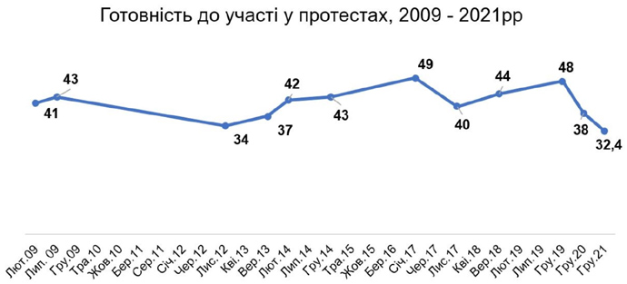 У грудні 2021 року в акціях протесту готові брати участь 32,4% дорослих жителів України. Рівень готовності до участі в акціях соціального протесту знизився на 5,6% порівняно з 2020 роком".