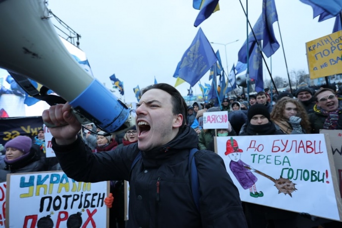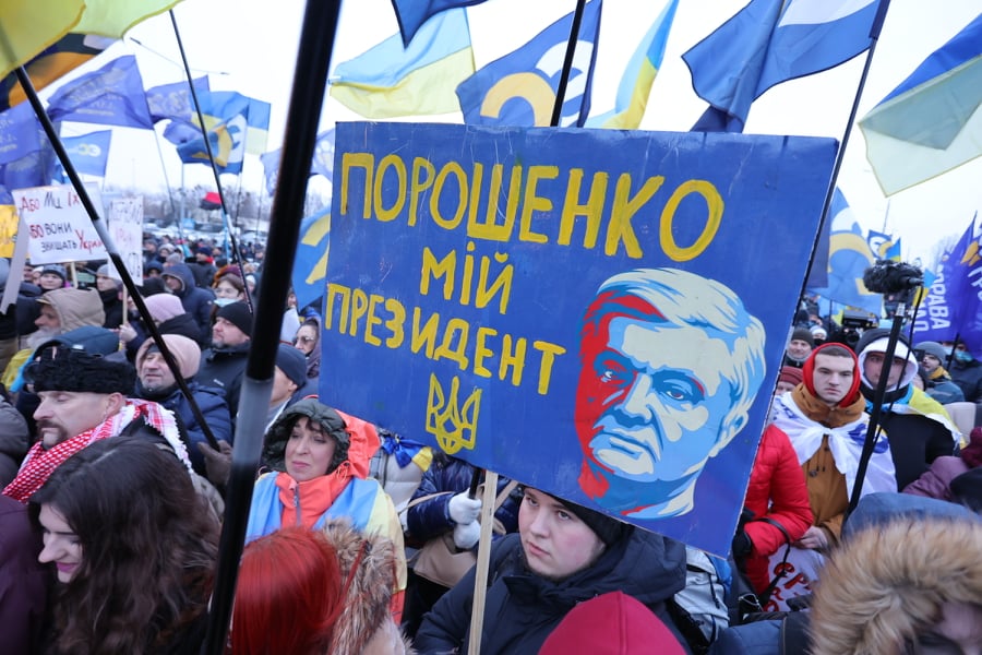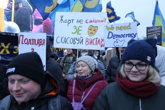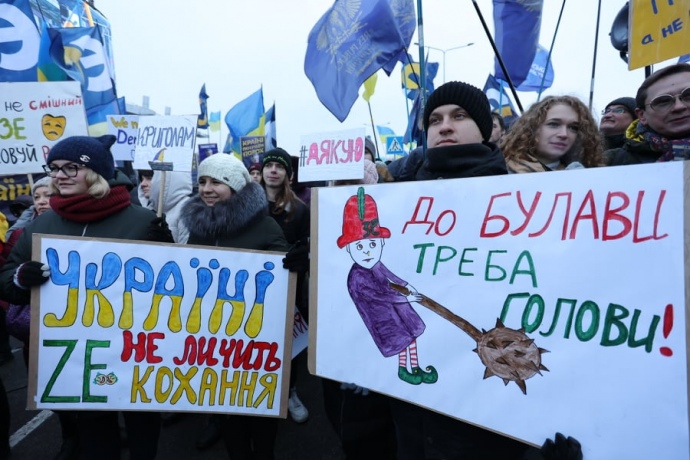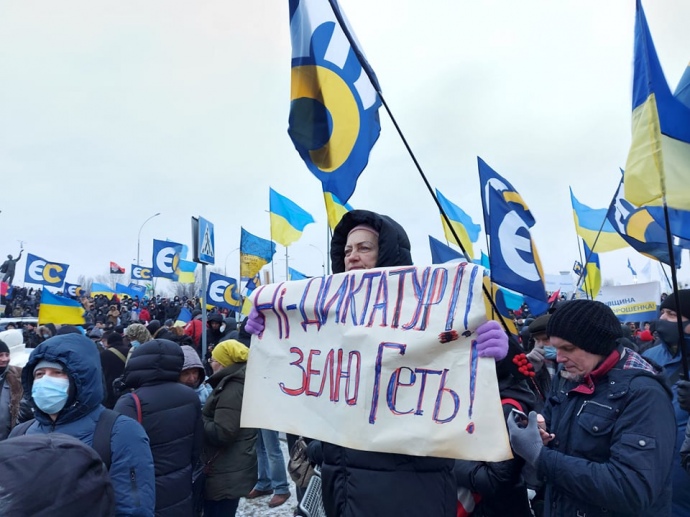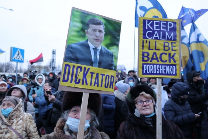 Вони тримають у руках плакати з гаслами: "Ні диктатурі", "Україні не личить Ze-кохання", "Україні потрібен Порох", "I’ll be back, Poroshenko", "Порох є – дамо вогню" тощо.