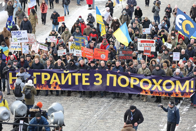 Люди несуть великий банер "Не грайте з Порохом" і вигукують "Володя, ми до тебе йдемо".