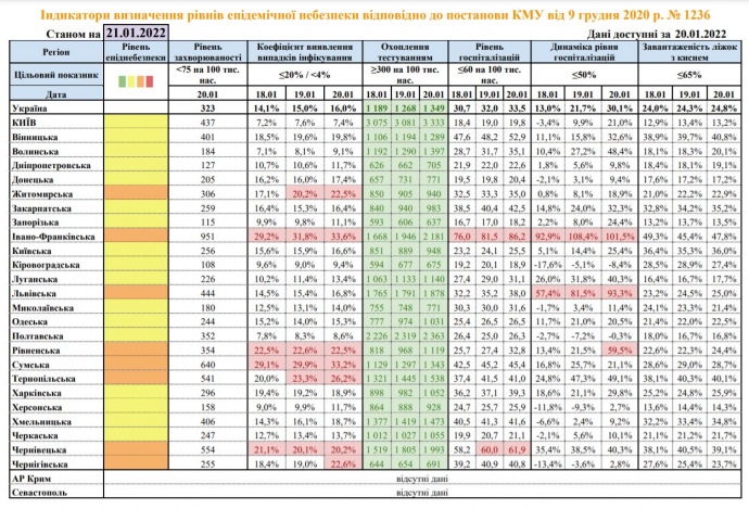 Станом на ранок 21 січня в Україні 8 областей віднесено до помаранчевої зони епідемічної небезпеки: Івано-Франківська, Львівська, Рівненська, Тернопільська, Чернівецька, Житомирська, Чернігівська та Сумська,