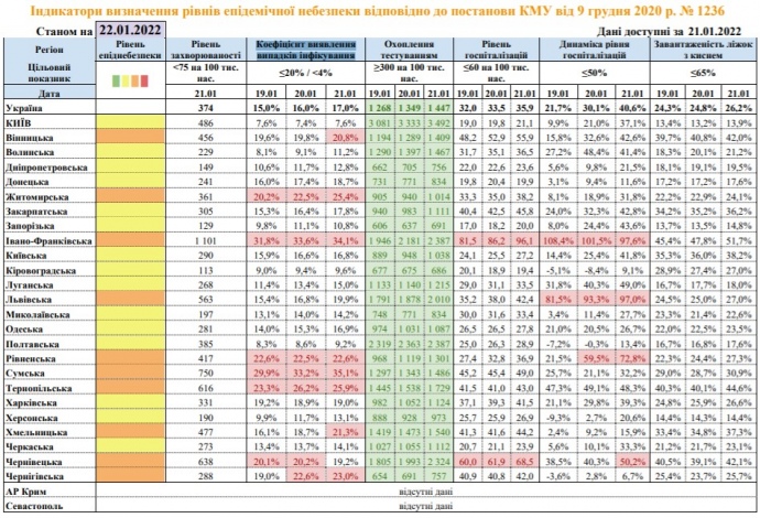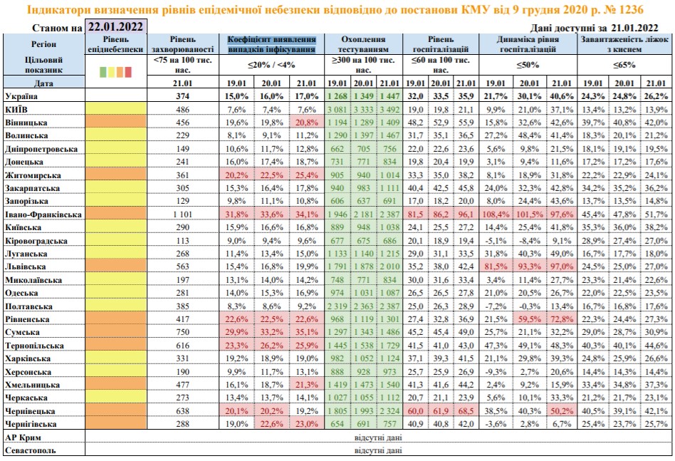 Станом на ранок 22 січня в Україні 10 областей віднесено МОЗ до помаранчевої зони епідемічної небезпеки: Вінницька, Житомирська, Івано-Франківська, Львівська, Рівненська, Сумська, Тернопільська, Хмельницька, Чернівецька і Чернігівська.