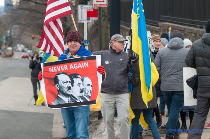 Під посольством Росії у США на акцію протесту під гаслом: "Зупиніть Путіна зараз! Скажіть "ні! " російській війні в Україні" вийшли близько пів сотні українських активістів, громадських діячів та небайдужих громадян.