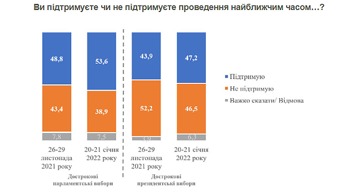 Дослівно КМІС: "Проведення дострокових парламентських виборів підтримують 53,6% респондентів, не підтримують – 38,9%. Водночас вважають, що потрібно провести дострокові президентські вибори – 47,2%. Стільки ж респондентів (46,5%) не підтримують проведення дострокових президентських виборів".
