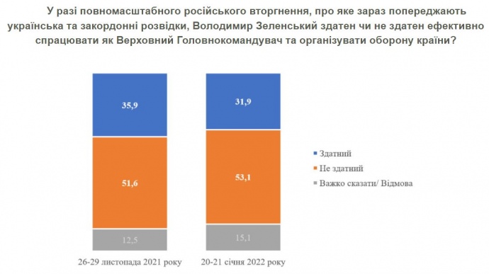 Понад 50% українців не вірять, що президент Володимир Зеленський здатен буде ефективно спрацювати як верховний головнокомандувач у разі російського вторгнення.